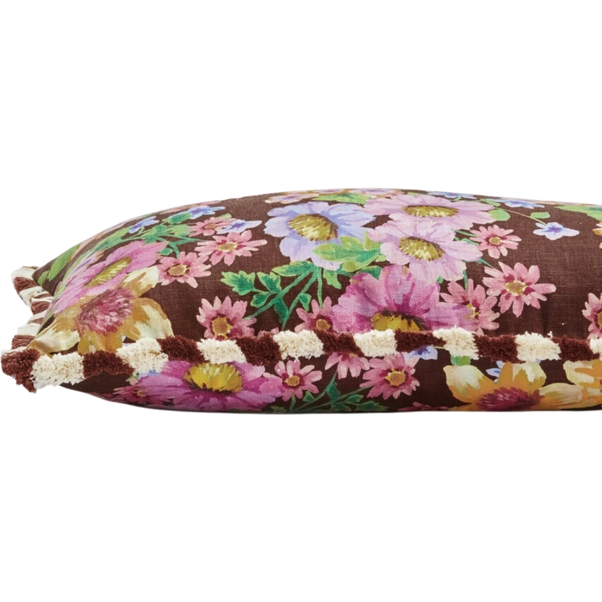 This brown linen cushion features the Buttercup design: a floral pattern inspired by sunlit gardens and vintage prints. Warm tones make it an inviting accent for sofas, beds, or reading nooks.